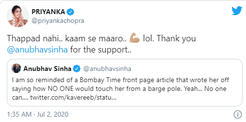 ​Priyanka Chopra Jonas: an actress, a producer, a global icon, a philanthropist, an entrepreneur, and a business woman, and an inspiration for many, has over 26 million Twitter followers. Priyanka, who recently signed a multi-million dollar deal with Amazon Studios for television content, got a shout-out from filmmaker Anubhav Sinha on Twitter and responded with a tweet. In his tweet, Anubhav Sinha referred to an old article which spoke disparagingly about Priyanka when it came out several years ago, only to highlight Priyanka’s career graph which is going upward. In response, Priyanka made a reference to Anubhav Sinha’s film ‘Thappad’ which stared Taapsee Pannu in the lead, and wrote this tweet: “Thappad nahi… kaam se maaro (Don’t slap, kill them with work). LOL. Thank you Anubhav Sinha, for the support.”