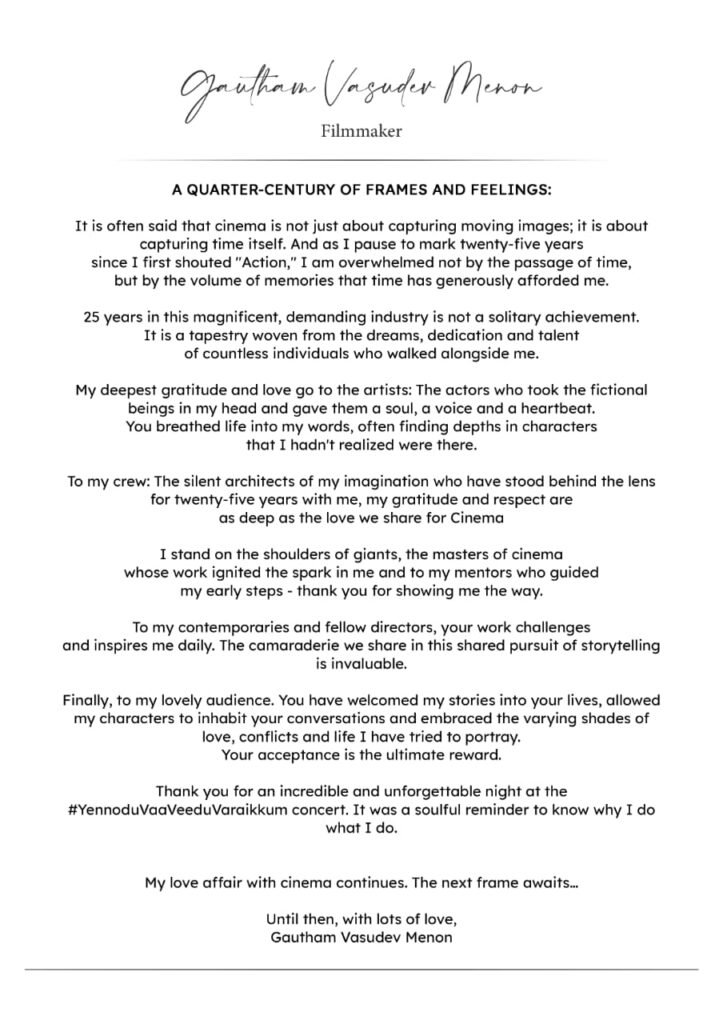 தமிழ் சினிமாவில் தனது 25 ஆண்டுகால பயணத்தை நினைவுகூரும் வகையில், இயக்குநர் கௌதம் வாசுதேவ் மேனன் 01.02.2026 அன்று நடைபெற்ற “Yennodu Vaa Veedu Varaikkum” இசைக் கச்சேரி நிகழ்வுக்குப் பிறகு, மனம் நிறைந்த நன்றிக் குறிப்பை வெளியிட்டுள்ளார்.